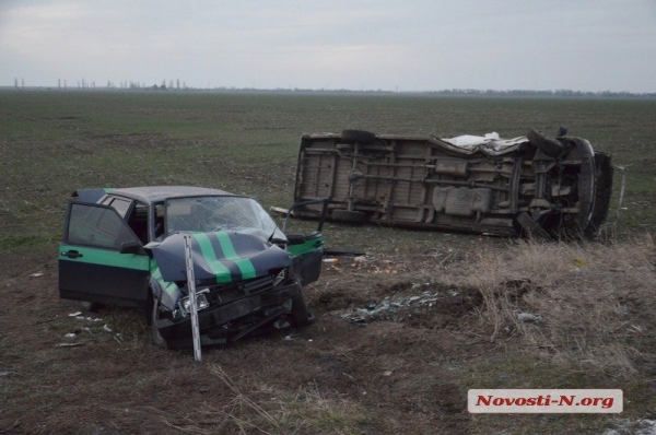 Инкассаторский автомобиль ехал со стороны райцентра Березнеговатое в направлении Николаева. На перекрестке слева по ходу движения ВАЗа выехал микроавтобус. Инкассаторский автомобиль на полном ходу врезался в правый бок "Фольксвагена". От мощного удара оба автомобиля слетели с дороги, несколько раз перевернулись и остановились в поле.