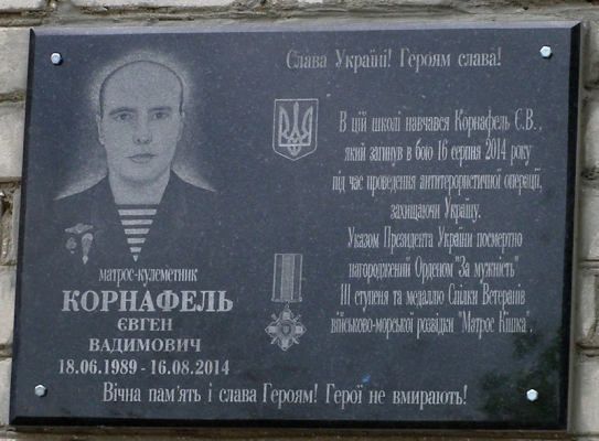 Евгений Вадимович Корнафель – уроженец г.Очакова. В 2006 году окончил Очаковскую общеобразовательную школу I-III ступеней №4, в 2011 г. — Одесскую национальную академию, где и получил высшее образование. С 18.02.2013 был призван в ряды Вооруженных Сил Украины, служил пулеметчиком взвода охраны роты воинской части А1594 Военно-Морских Сил Вооруженных Сил Украины. Погиб 16 августа 2014 года. Союз Ветеранов военно-морской разведки посмертно наградил «морского котика» 73-го центра специального назначения матроса-пулеметчика медалью «Матрос Кошка». Указом Президента Украины от 08.09.2014 № 708/2014 «О награждении государственными наградами Украины» за личное мужество и героизм, проявленные в защите государственного суверенитета и территориальной целостности Украины, Евгений посмертно награжден Орденом «За мужество» III степени.
