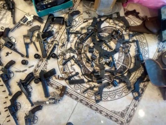 В результате были обнаружены и изъяты 20 револьверов системы «Наган», 2 пистолета «ТТ», один пистолет «ПМ», один пистолет «Браунинг» времен Второй Мировой войны, две винтовки Мосина и большое количество запасных частей к разного вида оружию (рамки со стволом, ударно-спусковые механизмы и стволы к стрелковому оружию), а также оборудование для оружия и значительное количество боеприпасов.