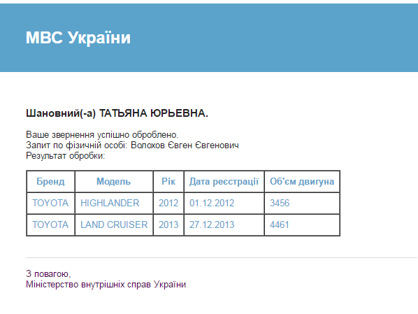 Згідно з випискою з Єдиного державного реєстру МВС, вищевказані автомобілі Toyota Highlander 2012 р. в. і Toyota Land Cruiser 2013 р. в. загальною вартістю близько 2 млн. грн. записано на сина Волохова – Євгена.