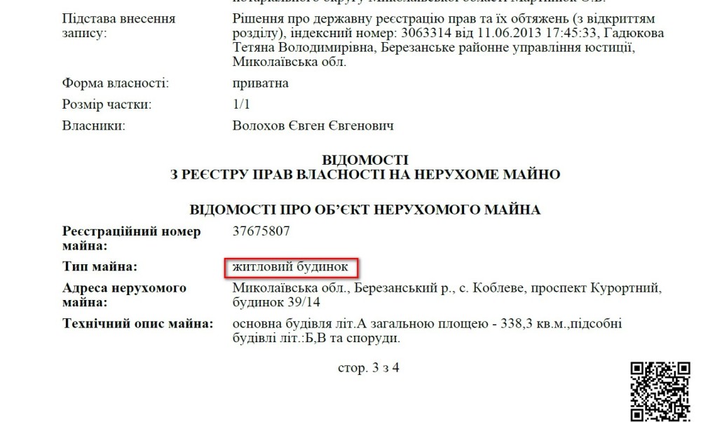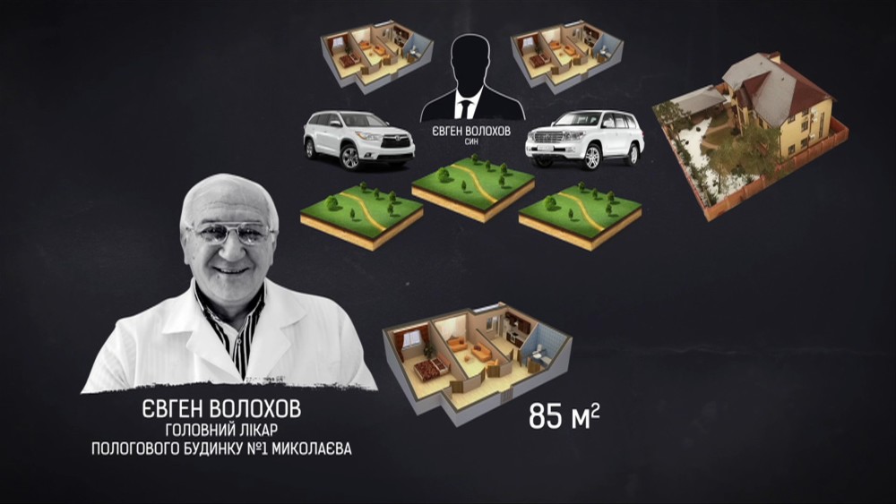 За тридцять років Євген Волохов встиг не лише здобути статус, а й непогано заробити. Щоправда, майже все майно він записав на сина. А це: дві квартири по 42 і 85 квадратних метрів, два позашляховики, на яких сам і їздить, три земельні ділянки та шикарний будинок біля моря. Сам головний лікар володіє в Миколаєві квартирою площею 85 квадратних метрів.