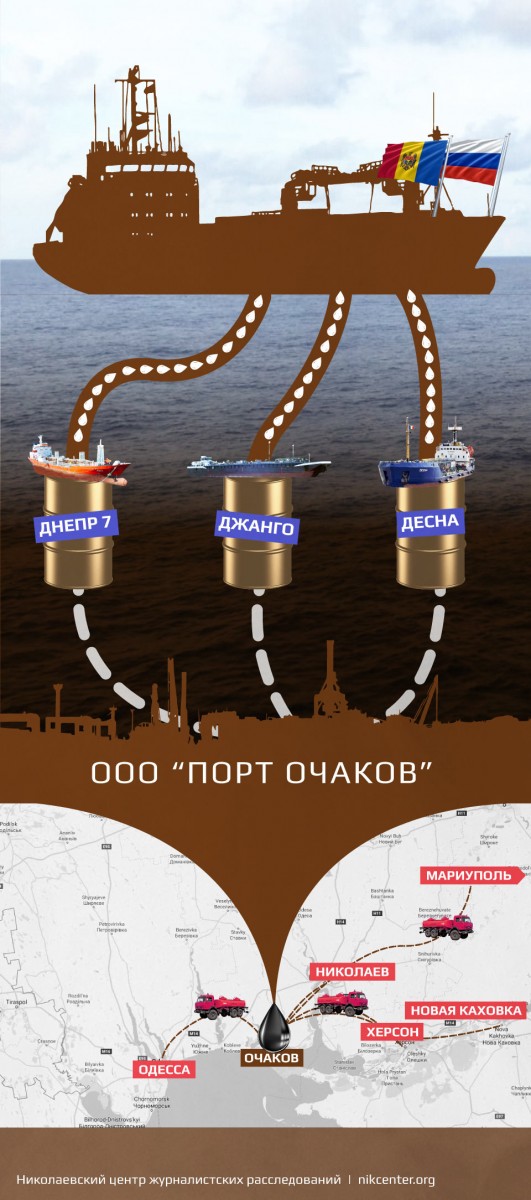 Судно “Джанго” отримує паливо з російських суден у відкритому морі, потім завозить в Очаків. Усі морські служби і прикордонники це бачать, але жодних заходів не вживають. З порту машинами ПММ уже розвозять далі по інших областях.