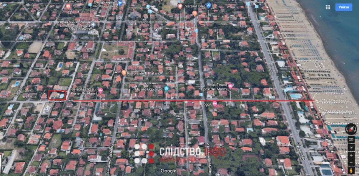 Згідно з документами, отриманими Слідством.Інфо, у 2017 році італійська фірма San Tommaso S.R.L., задекларована Зеленським, придбала 15-кімнатний будинок у тосканському містечку Форте-дей-Мармі. За нього італійська фірма заплатила 3,8 мільйона євро. Будинок розташований усього в 600 метрах від моря — вісім хвилин пішки до пляжу.