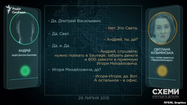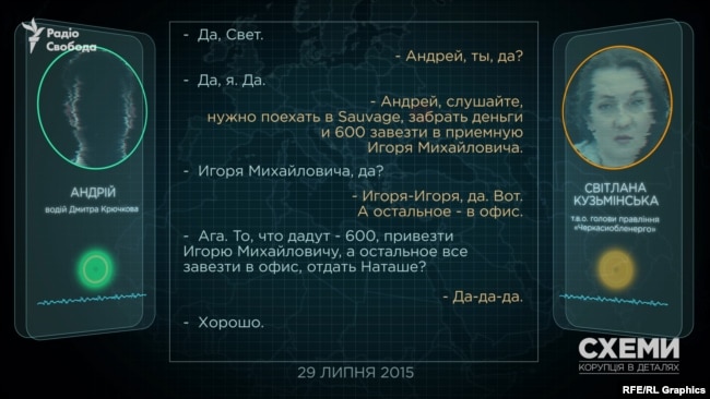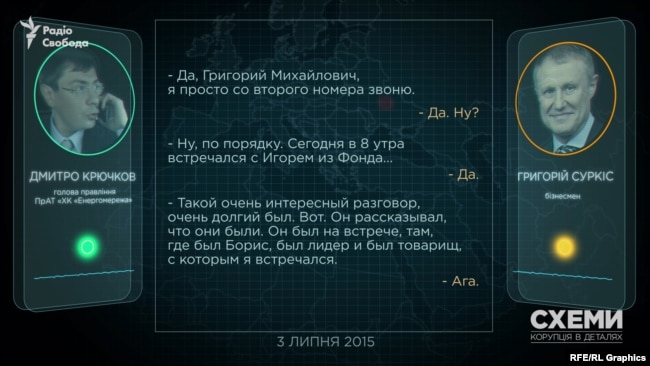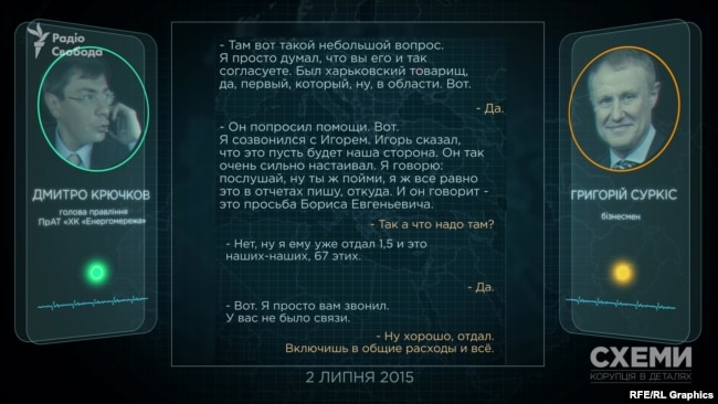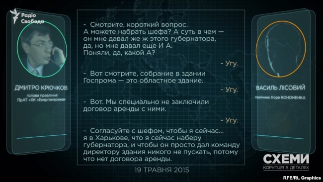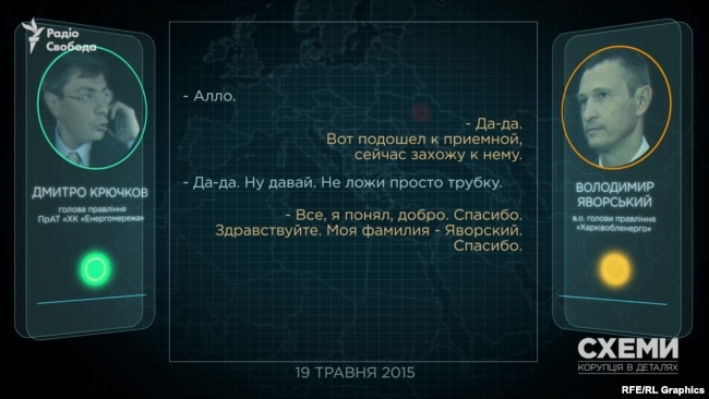 «Схемам» вдалося отримати записи телефонних розмов бізнесмена Дмитра Крючкова, завдяки яким можна почути відповіді на ці питання. Події охоплюють період весни-літа 2015 року, коли остаточно формується вертикаль влади після революційних подій – а різні напрямки закріплюються за конкретними кураторами та виконавцями. Експертиза довела високу вірогідність, що голоси співрозмовників є справжніми.