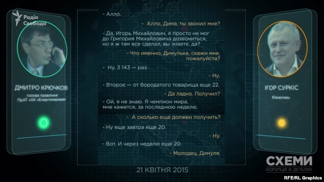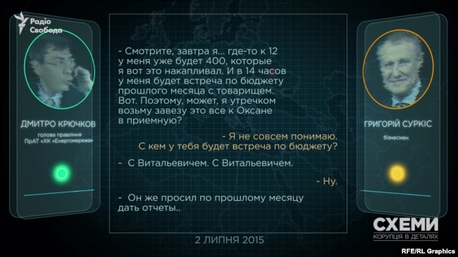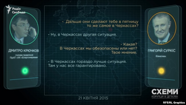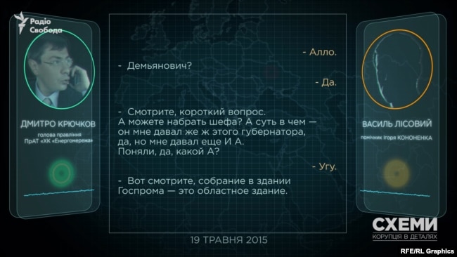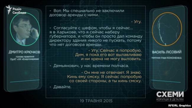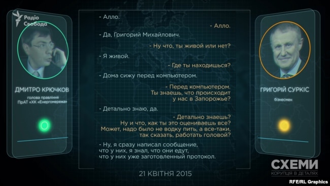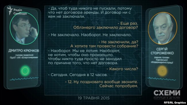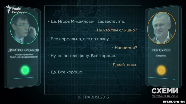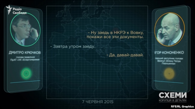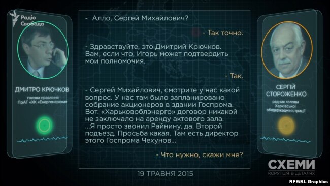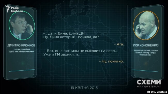 Під час розмови, датованої 19 квітня 2015 року, Дмитро Крючков звітує Кононенку, що вже винайдена схема, як зірвати збори акціонерів «Запоріжжяобленерго», призначені на 21 квітня – щоб на засіданні не змінили його керівника.