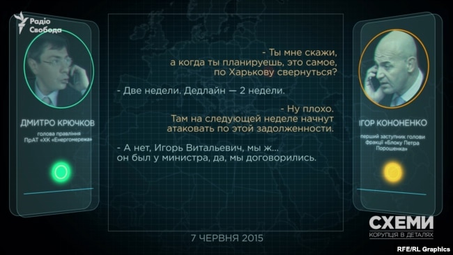 Телефонні розмови Крючкова щодо «Харківобленерго» продовжилися й у червні. Соратник президента Ігор Кононенко тримає з ним прямий зв’язок, дає настанови щодо фінансових операцій і просить відзвітуватись перед Дмитром Вовком – їхнім з Порошенком ставлеником у Національній комісії, що здійснює державне регулювання у сферах енергетики та комунальних послуг, колишнім менеджером корпорації «Рошен».