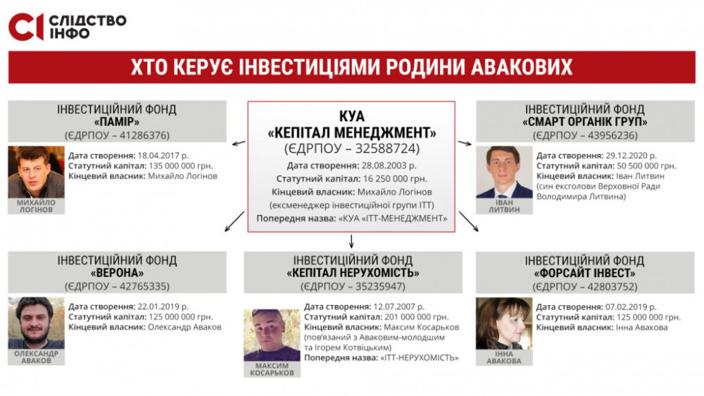 Слід зазначити, що останні півтора року Михайло Логінов володіє компанією з управління активами (КУА) «Кепітал Менеджмент», яка керує активами родини міністра МВС Арсена Авакова. Вона обслуговує щонайменше три фонди, пов’язані з родиною Арсена Авакова. Перший — фонд «Кепітал Нерухомість», де бенефіціаром є Максим Косарьков, якого ми згадували як власника авто Daewoo Lanos та квартири у Гостомелі. Другий — «Форсайт Інвест», яким рік тому почала володіти Інна Авакова — дружина міністра внутрішніх справ. Третій фонд «Верона», про який — трохи згодом.