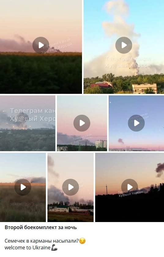 "Херсонщина. З самого ранку в Новокаховській громаді чути вибухи. Знову горять і детонують боєприпаси ворога. Салюти для хороших — мертвих росіян, які вже ніколи не прокинуться", — повідомив у Facebook радник голови Херсонської ОВА Сергій Хлань.