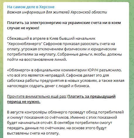 Разом з тим окупантські структури, створені на базі захоплених загарбниками херсонських підприємств, через підконтрольні пібліки закликають людей не платити українським структурам, а дочекатися розробки «нових тарифів».