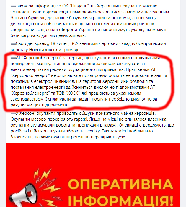 Зокрема, такі заклики розміщує в соцмережах АТ «Херсонобленерго».