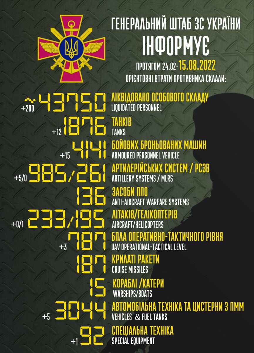 Російські окупанти з 24.02 по 15.08 втратили близько 47,8 тисячі вояк та 1876 танків.