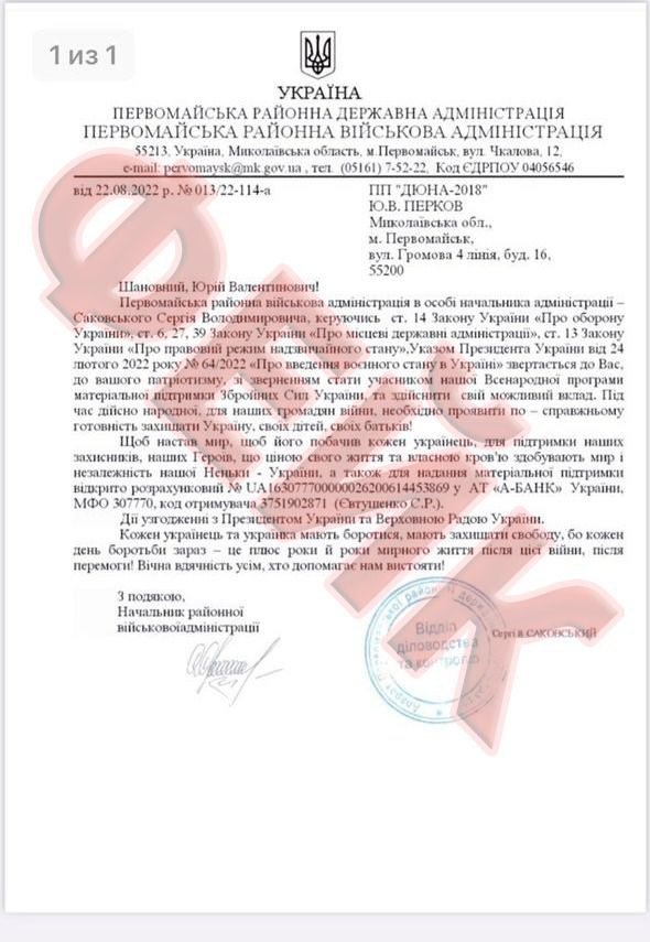 Керівники та співробітники деяких підприємств у Первомайському районі отримали фейкові листи начебто від імені начальника районної військової адміністрації Сергія Саковського з проханням перерахувати гроші нібито на потреби Збройних сил України. Сам Саковський причетність свою та адміністрації до будь-яких зборів заперечує.