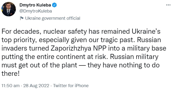 «Російські окупанти перетворили Запорізьку АЕС на військову базу, поставивши під загрозу безпеку всього континенту. російські військові повинні піти геть зі станції — їм там нема чого робити», – написав Дмитро Кулеба у Twitter.