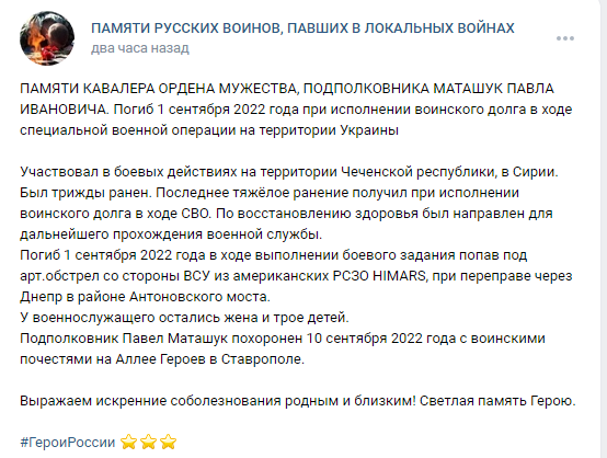 «Загинув 1 вересня 2022 року в ході виконання бойового завдання, потрапивши під артобстріл з боку ЗСУ з американських РСЗВ HIMARS, при переправі через Дніпро в районі Антонівського мосту», – йдеться повідомленні.