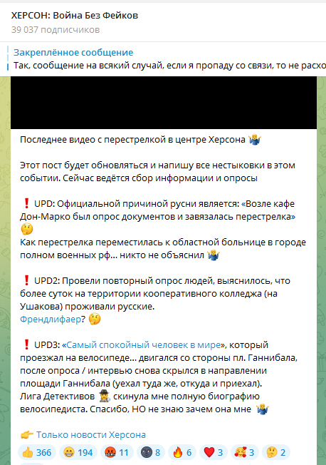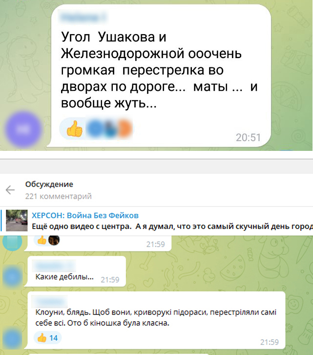 А переважна більшість містян чудово зрозуміли, що російські окупанти влаштували в центрі міста провокацію зі стріляниною. Є різні версії того, що могло спричинити півторагодинну перестрілку. Кажуть про пропагандистський «бойовик», знятий для красивого звіту перед начальством. Згадують, що незадовго до цього в місто прибули кадирівці, яких називають «ТикТок-війська», які дуже полюбляють замість участь в реальних бойових діях зніматися у відео зі стріляниною, а потім ілюструвати цими відео свої розповіді про «подвиги» у «війні з укронацистами».