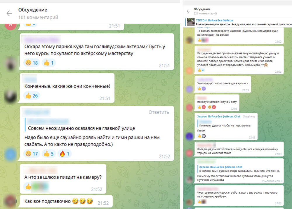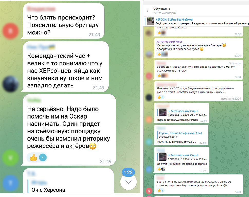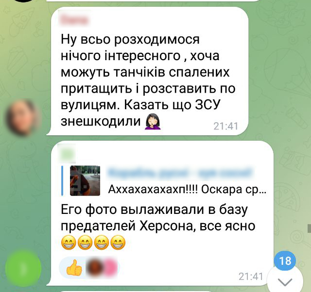 В місцевих пабліках люди писали, що мала місце пропагандистська вистава. Якщо в Херсоні хтось і повірив в «офіційну» версію окупаційної влади про перестрілку росгвардійців з невідомими «диверсантами», то це, мабуть, дуже і дуже небагато людей.