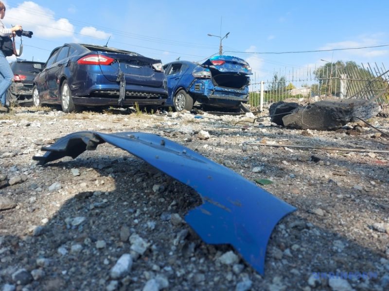 На місці влучання ракети залишилась величезна воронка, глибиною метрів п'ять. Автомийка зруйнована вщент, на стоянці стояли приватні автомобілі, пошкоджено близько 70 одиниць транспорту.