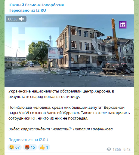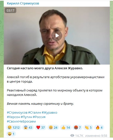 Крім того, так званий «заступник голови військово-цивільної адміністрації Херсонської області» Кирило Стремоусов підтвердив факт загибелі Олексія Журавка.