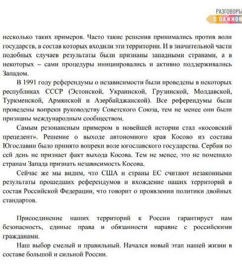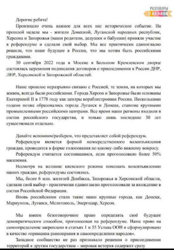 "Дітям мають розповісти, що Маріуполь завжди був Росією. Проклятий Захід не визнає законний референдум цього разу. А от референдум про незалежність України в 1991 році був незаконний, але його визнали. Загалом – читайте самі. Наші джерела передали повний текст, затверджений для озвучення".