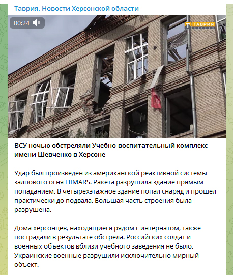 Зокрема, створений окупантами телеканал «Таврія» в сюжеті про удар по інтернату стверджував, що «російських солдатів та військових об’єктів поблизу навчального закладу не було. Українські військові зруйнували суто мирний об’єкт».