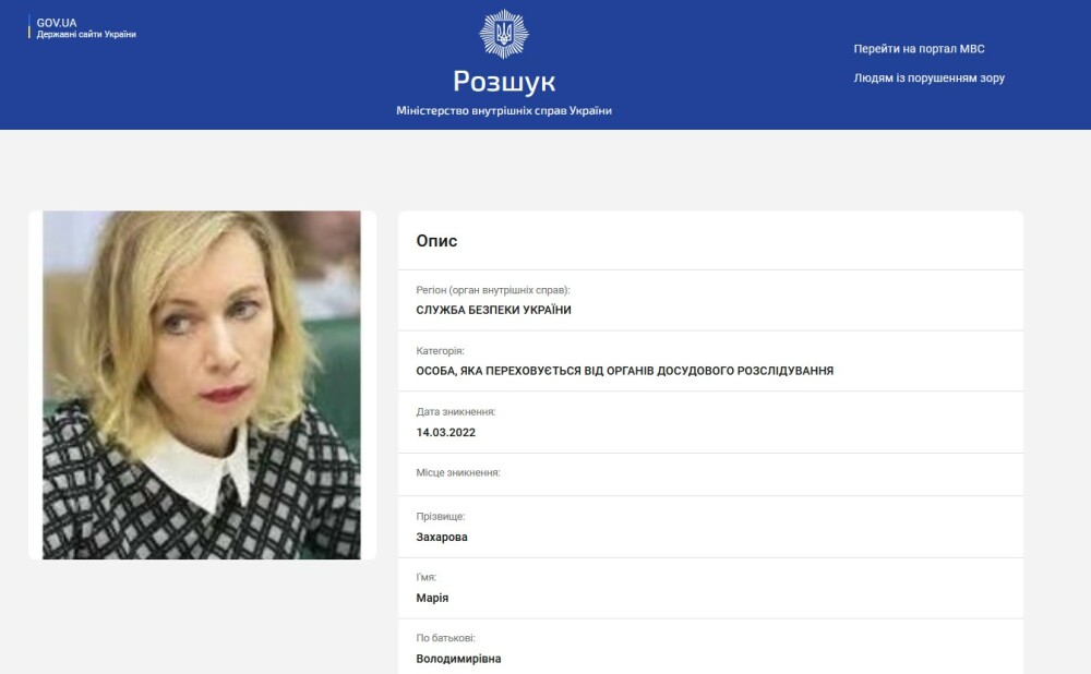 Також СБУ оголосила в розшук речницю російського МЗС Марію Захарову.
