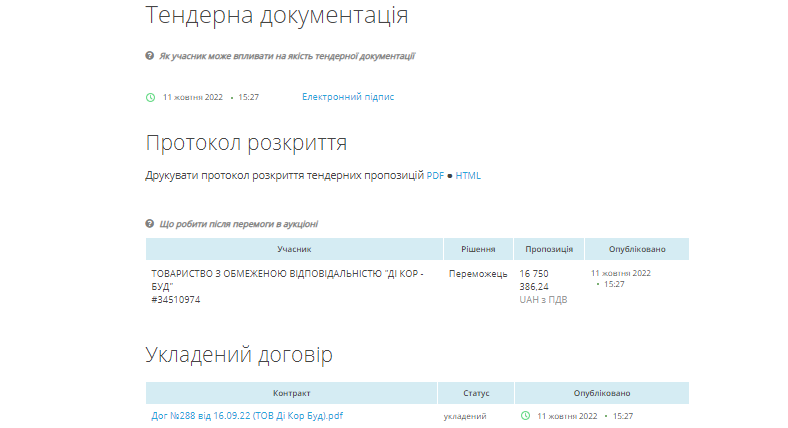 Договір було підписано 16 вересня, але звіт про закупівлю розміщено в системі ProZorro лише за місяць, 11 жовтня, повідомляє Центр журналістських розслідувань.