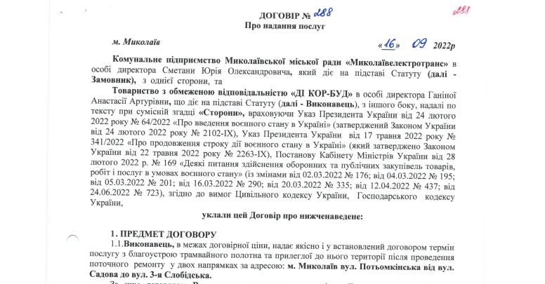 Для цього без конкурсу, на підставі спеціальної процедури для населених пунктів, що знаходяться в зоні бойових дій, «Миколаївелектротрансом» було укладено договір з миколаївським ТОВ «ДІ КОР-БУД».