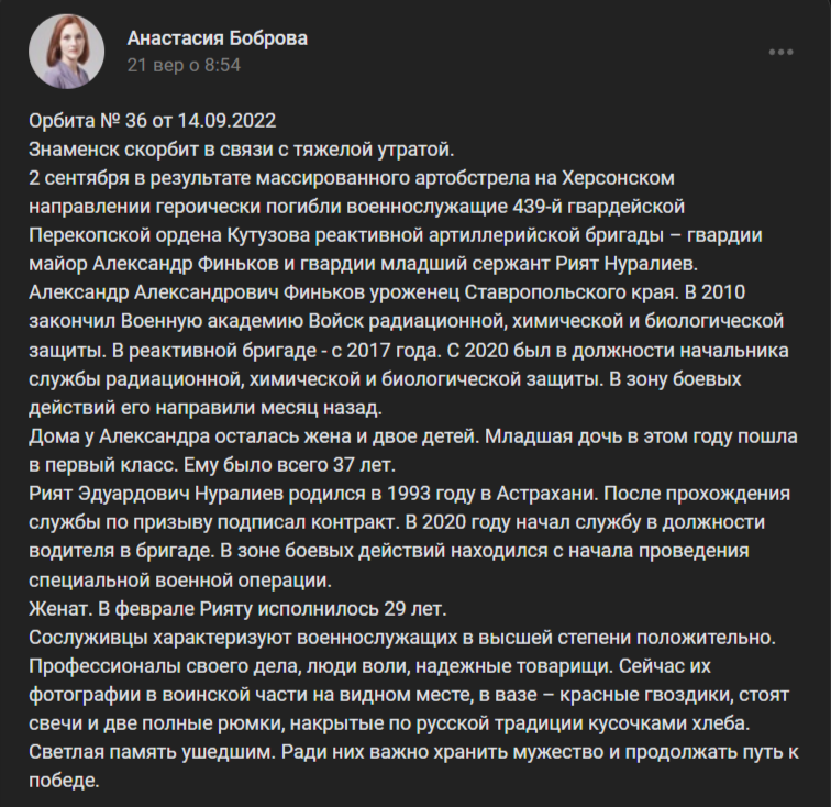 Як відомо з некрологів у російських соцмережах, серед загиблих окупантів з 439 бригади: майор Олександр Фіньков та молодший сержант Ріят Нуралієв. Як стверджують росіяни, вони “героїчно” померли внаслідок масованого артилерійського обстрілу.