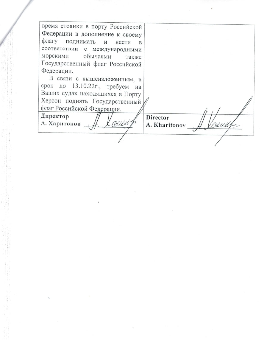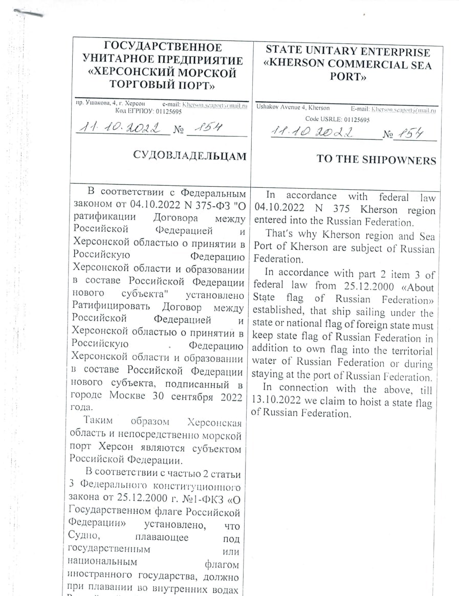 "…Встановлено, що судно, яке йде під державним або національним прапором іноземної країни, має під час плавання у внутрішніх водах Російської Федерації або під час стоянки в порту Російської Федерації на додаток до свого прапора, піднімати і нести відповідно до міднародних морських звичаїв також державний прапор Російської Федерації", – заявили окупанти.
