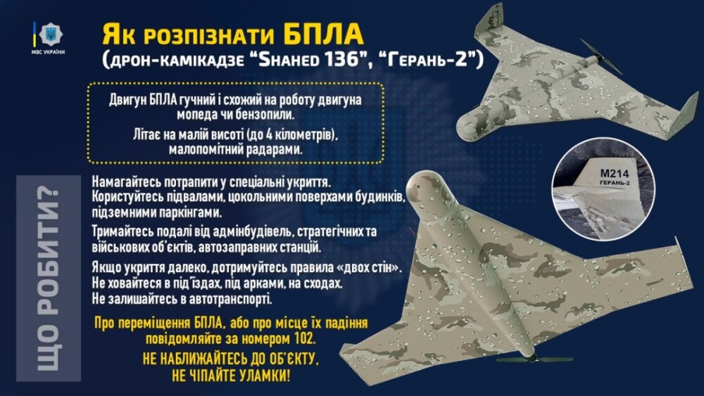 У МВС також радять громадянам, якщо вони чують звук цього БПЛА, намагатися потрапити в укриття, – користуватися підвалами, цокольними поверхами будинків, підземними паркінгами.