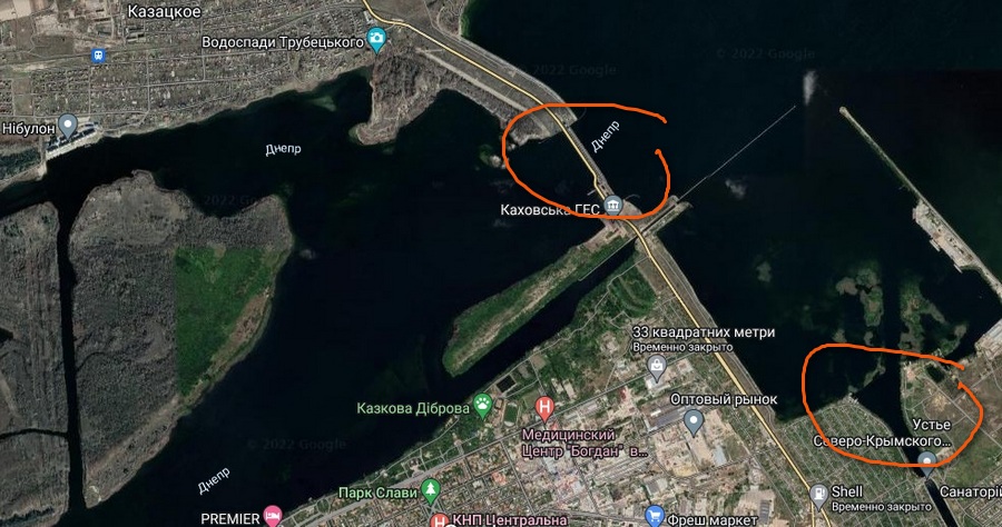 Дамба на 4 метри нижче мостового переходу. Якщо знищити верхні шлюзові ворота, то шістнадцятиметрове цунамі по каналу 20 метрів піде прямо на цю дамбу і змиє її. Вода буде знижуватись, бо Дніпро ширший ніж шлюзовий канал. Висота хвилі буде приблизно 2,5 метра і вона вдарить по берегу Нової Каховки в районі електроопор, де вони переходять до підстанції. Там житла немає. Просто зелені насадження, – розказує Молчанов.