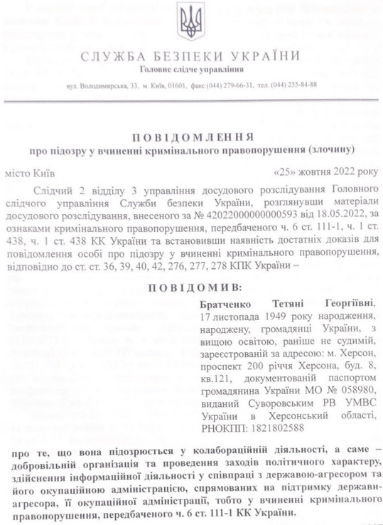 Це відбулось у період з 1 по 7 травня. Вже у проміжку з 15 до 18 червня Братченко публічно підтримала російську окупацію Херсона.