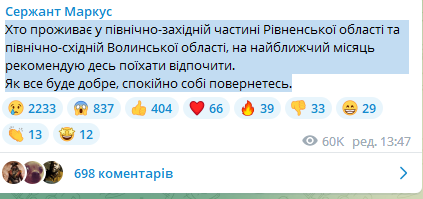 «Хто проживає у північно-західній частині Рівненської області та північно-східній Волинської області, на найближчий місяць рекомендую десь поїхати відпочити. Як все буде добре, спокійно собі повернетесь», – зазначив Валерій Маркус.