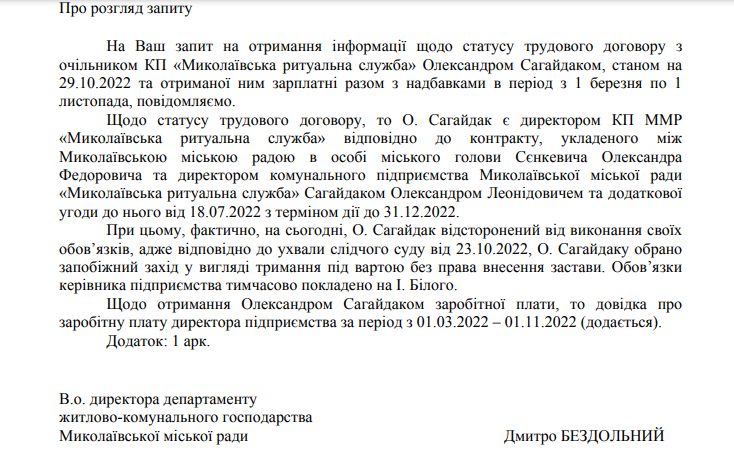Також із документу стало відомо, що підозрюваний у держзраді Сагайдак за договором буде вважатися директором комунального підприємства ще до кінця 2022 року. Наразі його відсторонили від виконання обов’язків.