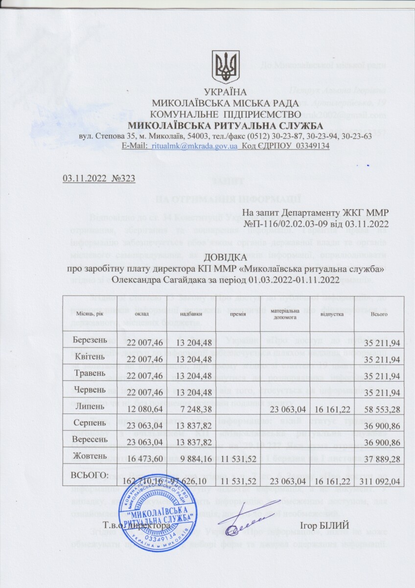 Директор комунального підприємства “Миколаївська ритуальна служба” Олександр Сагайдак, якого наприкінці жовтня затримали правоохоронці за підозрою у співпраці з російськими агентами, отримав премію за жовтень.