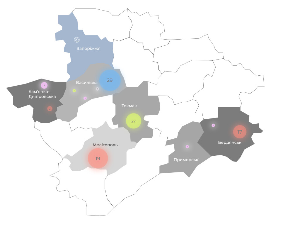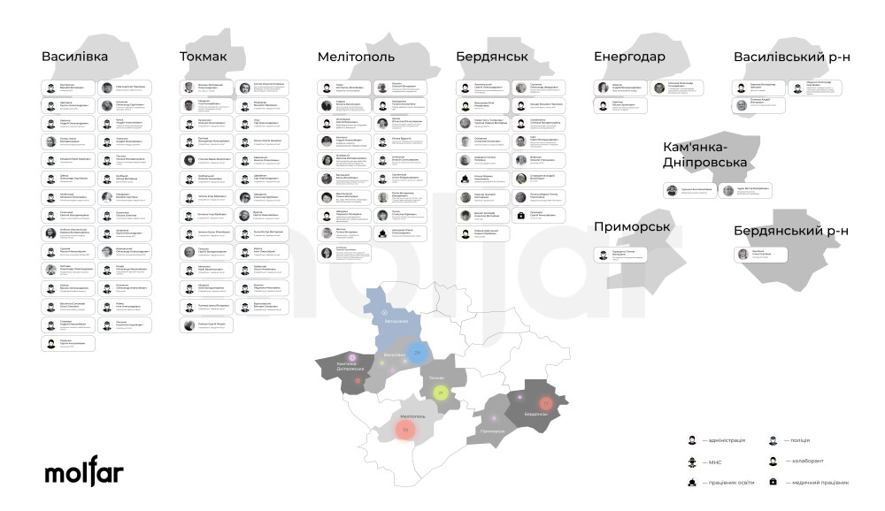 У Запорізькій області найбільше "працівників адміністрації" зафіксували у Мелітополі. Серед них Костянтин Тюрін, Олександр Ликов, Сергій Золотарьов, Ірина Донець, Галина Катющенко, Євген Станков.