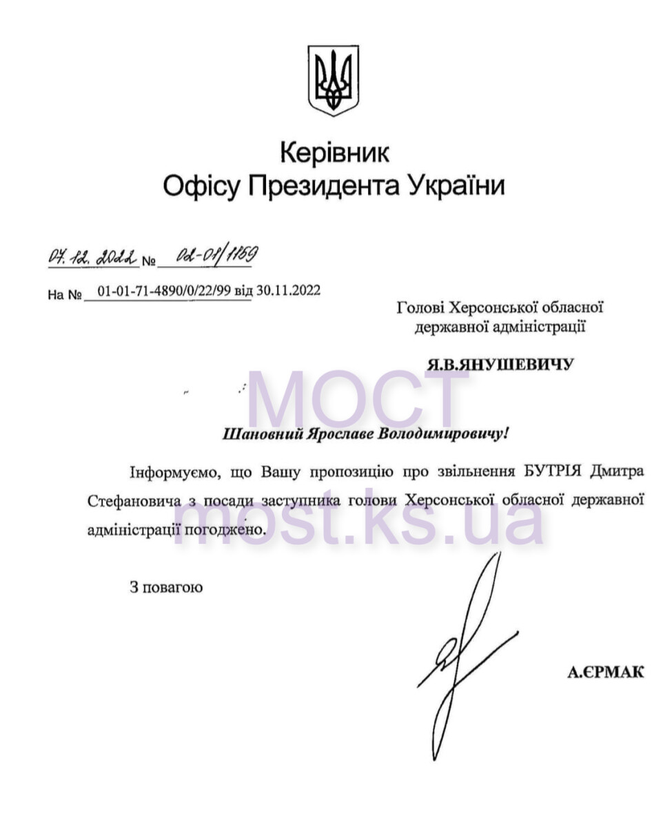 Голова Офісу Президента Андрій Єрмак погодив пропозицію голови Херсонської ОВА звільнити з посади Дмитра Бутрія. Про це йдеться у листі на імʼя Ярослава Янушевича від 7 грудня, повідомляє "Мост".