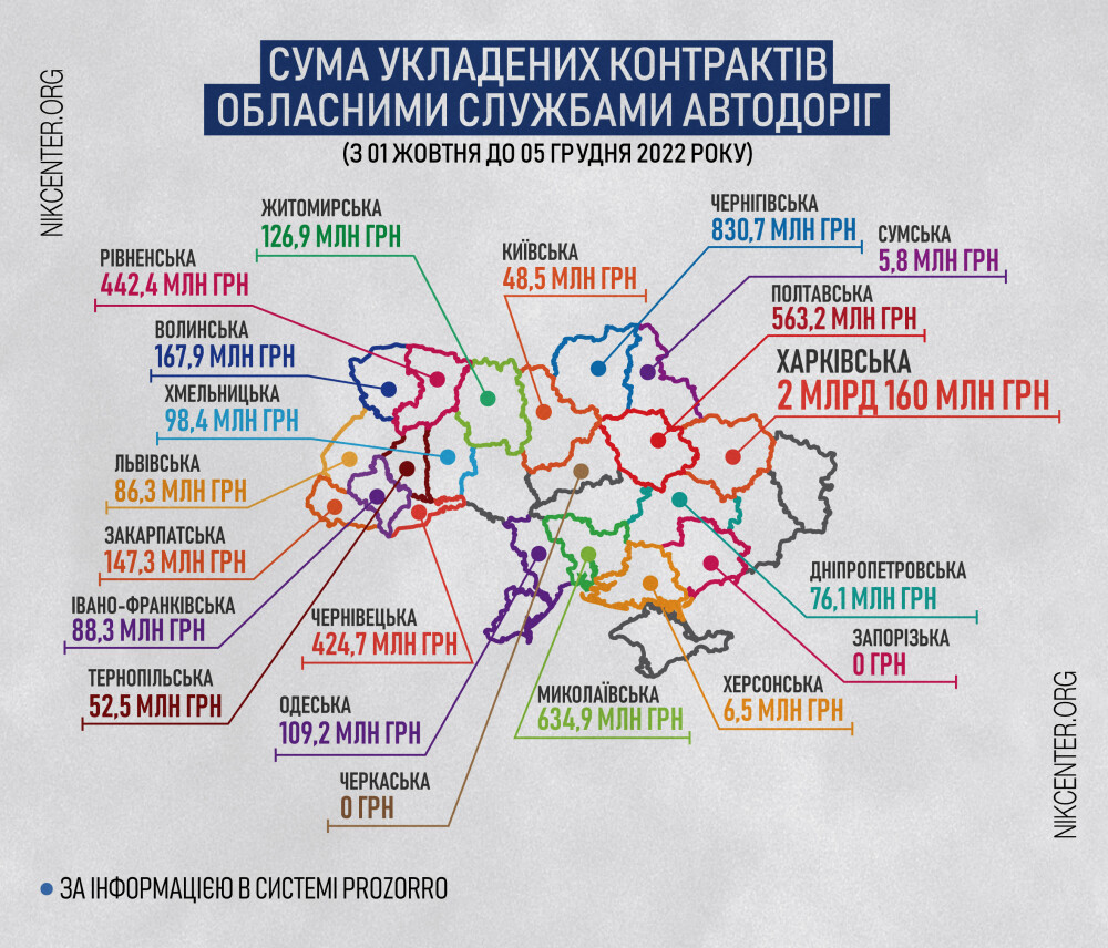 У решті регіонів України протягом жовтня-листопаду служби автодоріг прозвітували у ProZorro про контракти менше, ніж на 100 млн грн кожна. Так, у Хмельницькій області на утримання і ремонт доріг витратять 98,4 млн грн, в Івано-Франківській – 88,3 млн грн, у Львівській – 86,3 млн грн.