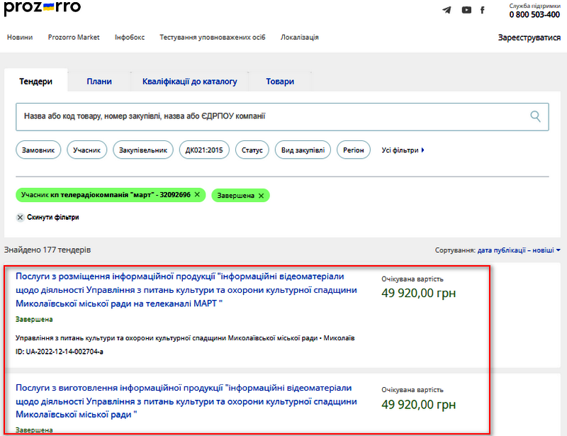 У грудні цього року міське управління з питань культури та охорони культурної спадщини уклало з КП «Телерадіокомпанія «МАРТ» два договори на 49,9 тис. грн кожний.