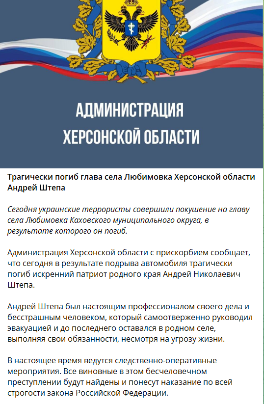 Зазначається, що Андрій Штепа, відомий як “Шнир”, керував Любимівкою і Василівкою Каховського району Херсонської області.