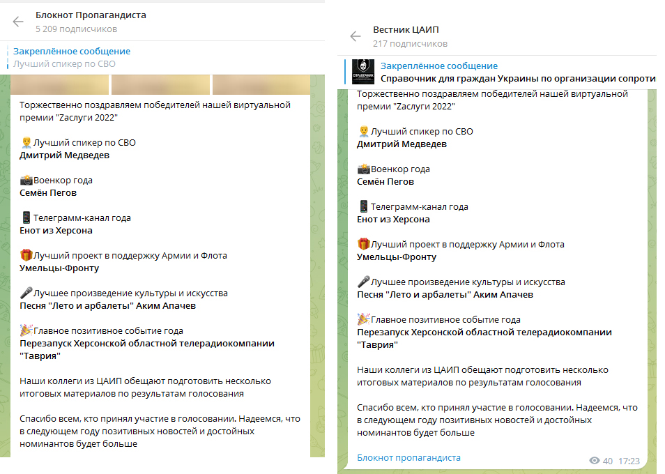 Щодо Телеграм-каналів, які проводили конкурс «Zаслуги 2022», то «Блокнот пропагандиста» має 5,2 тис. передплатників, а «Центр анализа и изучения пропаганды» – трохи більше 200-т.