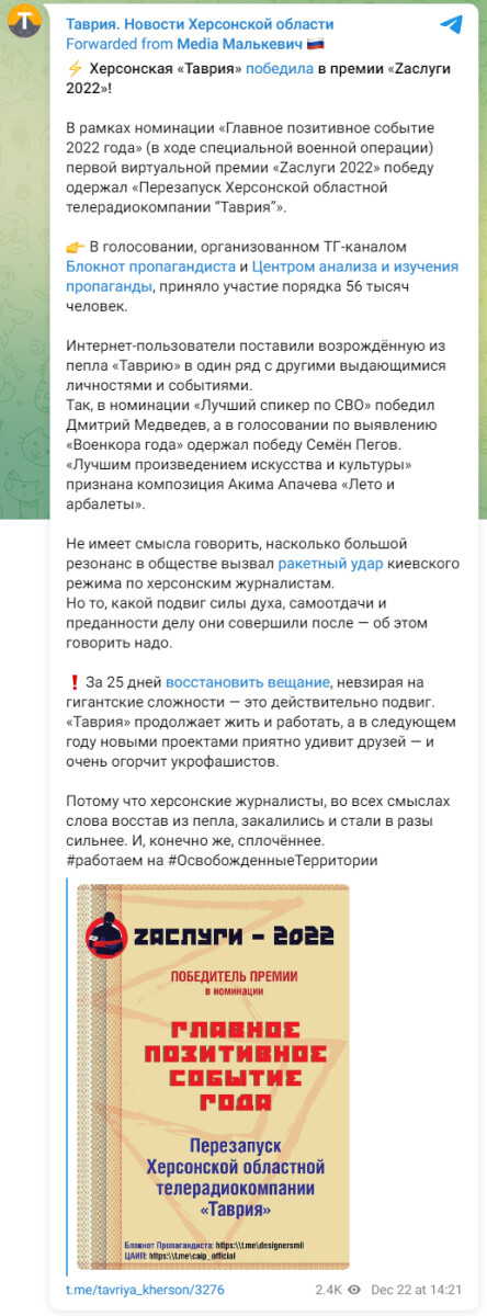 Пропагандистське медіа «Таврія», яке зараз працює на окупованій росіянами частині Херсонської області, перемогло в номінації «Головна позитивна подія 2022 року» конкурсу «Zаслуги 2022», влаштованого двома російськими Телеграм-каналами, які мають в своїх назвах слово «пропаганда». Це – «Блокнот пропагандиста» и «Центр анализа и изучения пропаганды».