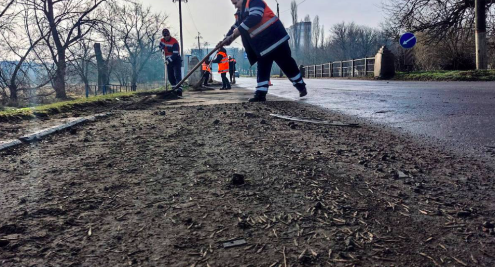Сьогодні, 1 січня, у Миколаєві комунальні служби ліквідовують наслідки вчорашньої ракетної атаки. Вони прибирають уламки, каміння та землю з проїжджої частини. Згодом полагодять частину дорожнього огородження.