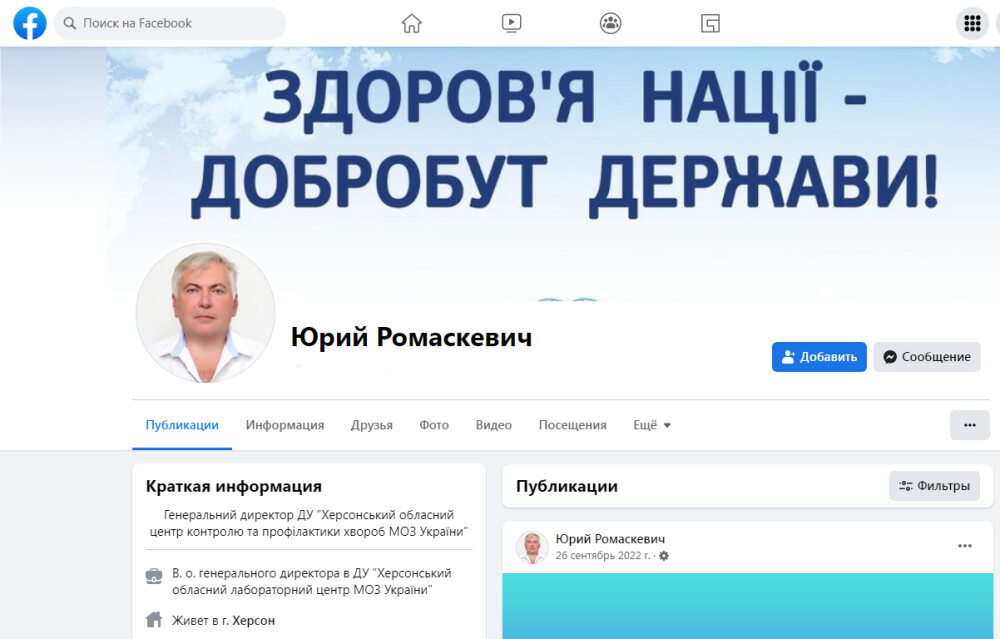 Головний державний санітарний лікар Херсонської області Юрій Ромаскевич, про колаборантство якого стало відомо ще в липні 2022 року, втік на окуповану росіянами частину Херсонської області, де вступив в КПРФ.