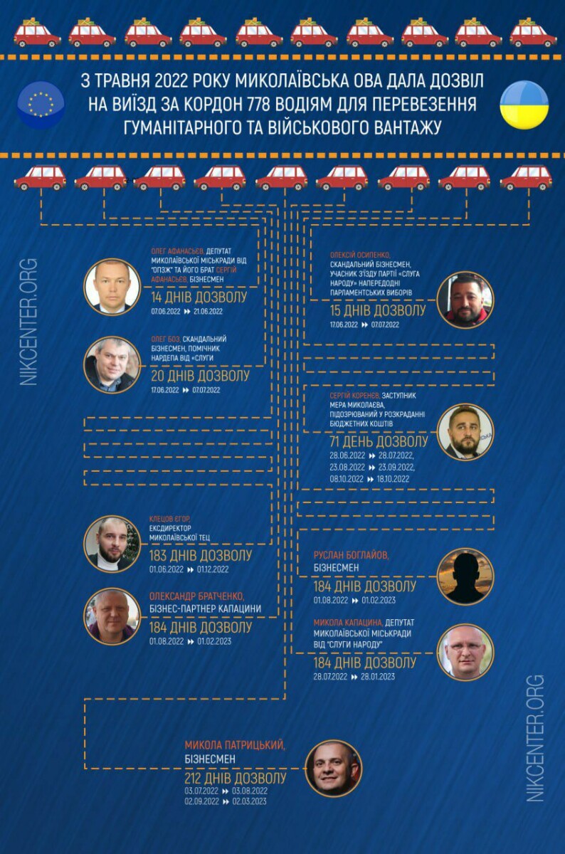 Депутат Миколаївської міської ради від партії «Слуга народу» Микола Капацина отримав від ОВА дозвіл на виїзд за кордон як волонтер на максимальні шість місяців. За даними, отриманими журналістами Центру, протягом 2022 року бізнесмен 12 разів виїжджав за кордон, двічі з яких – практично по місяцю проводячи поза територією України. Саме такий термін – максимум 30 днів – водій-волонтер може перебувати за кордоном, після цього, щоб уникнути штрафних санкцій, йому треба перетинати кордон.