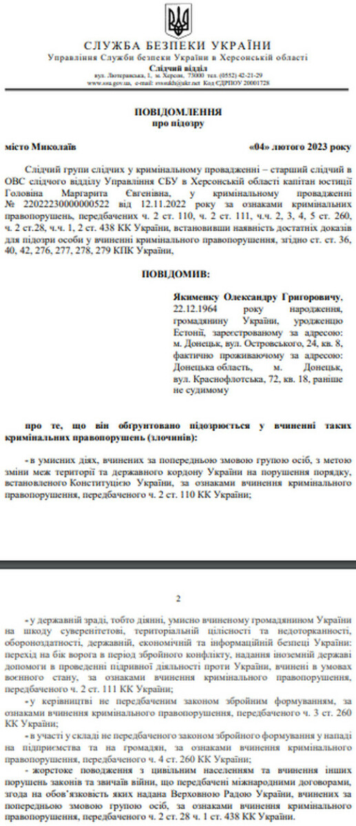 Якименку повідомили про підозру за 4 статтями Кримінального кодексу України: