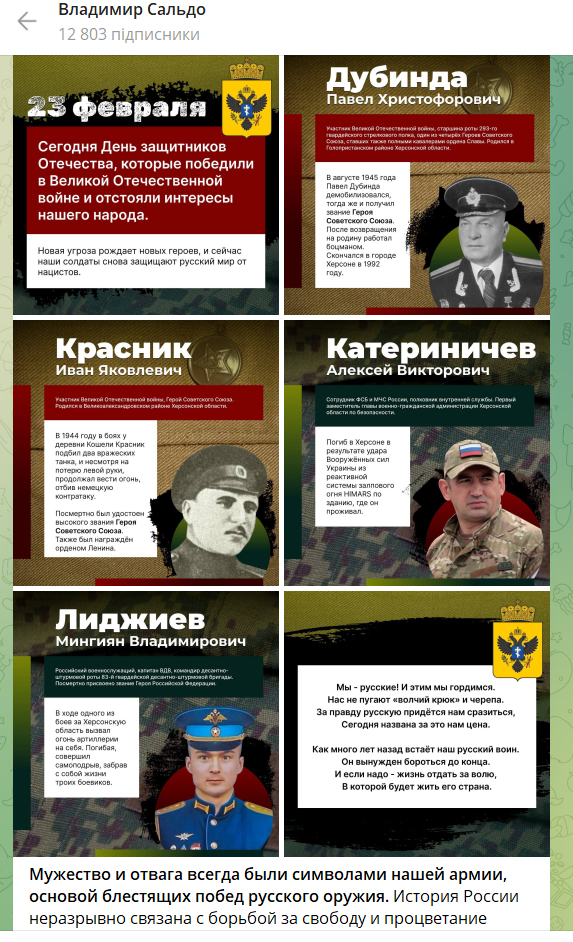 В Телеграм-каналі так званого «тимчасово виконуючого обов’язки губернатора Херсонської області» Володимира Сальдо та в деяких інших окупантських медіа з нагоди «дня захисника вітчизни» розміщена добірка фото мешканців Херсонщини, удостоєних під час Другої світової війни звання Герой Радянського Союзу і фото росіян, які брали участь в окупації Херсонської області, загинули і стали героями Росії.