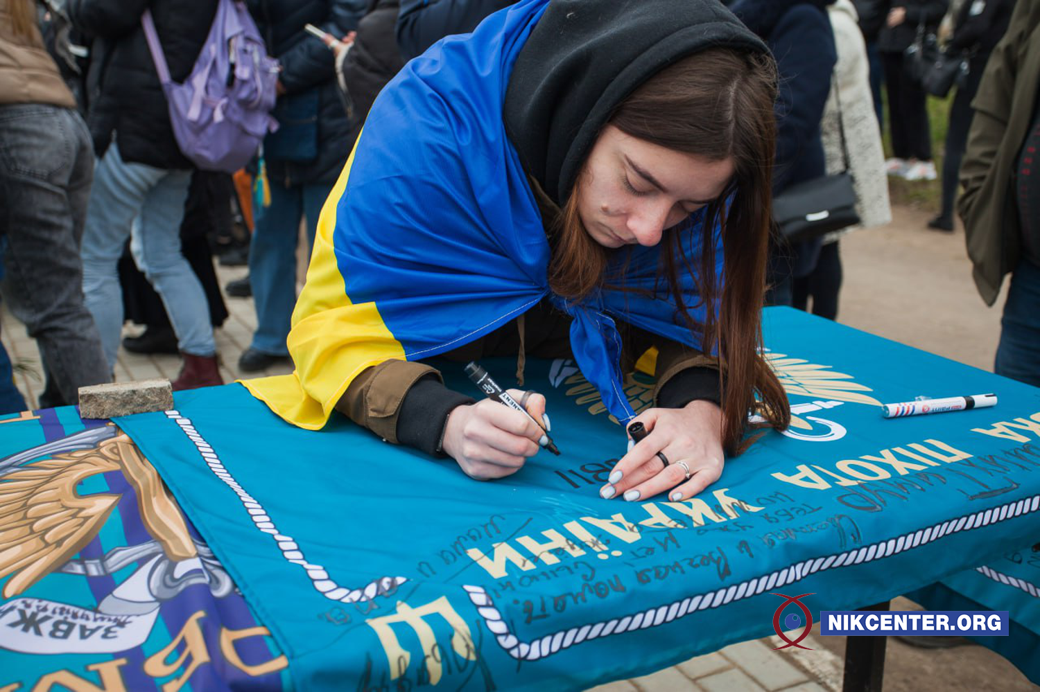 На українських прапорах і прапорі військової частини, де служили загиблі військові, рідні написали їхні імена. Великий прапор з прізвищами полеглих бійців розмістять на новому меморіальному комплексі.