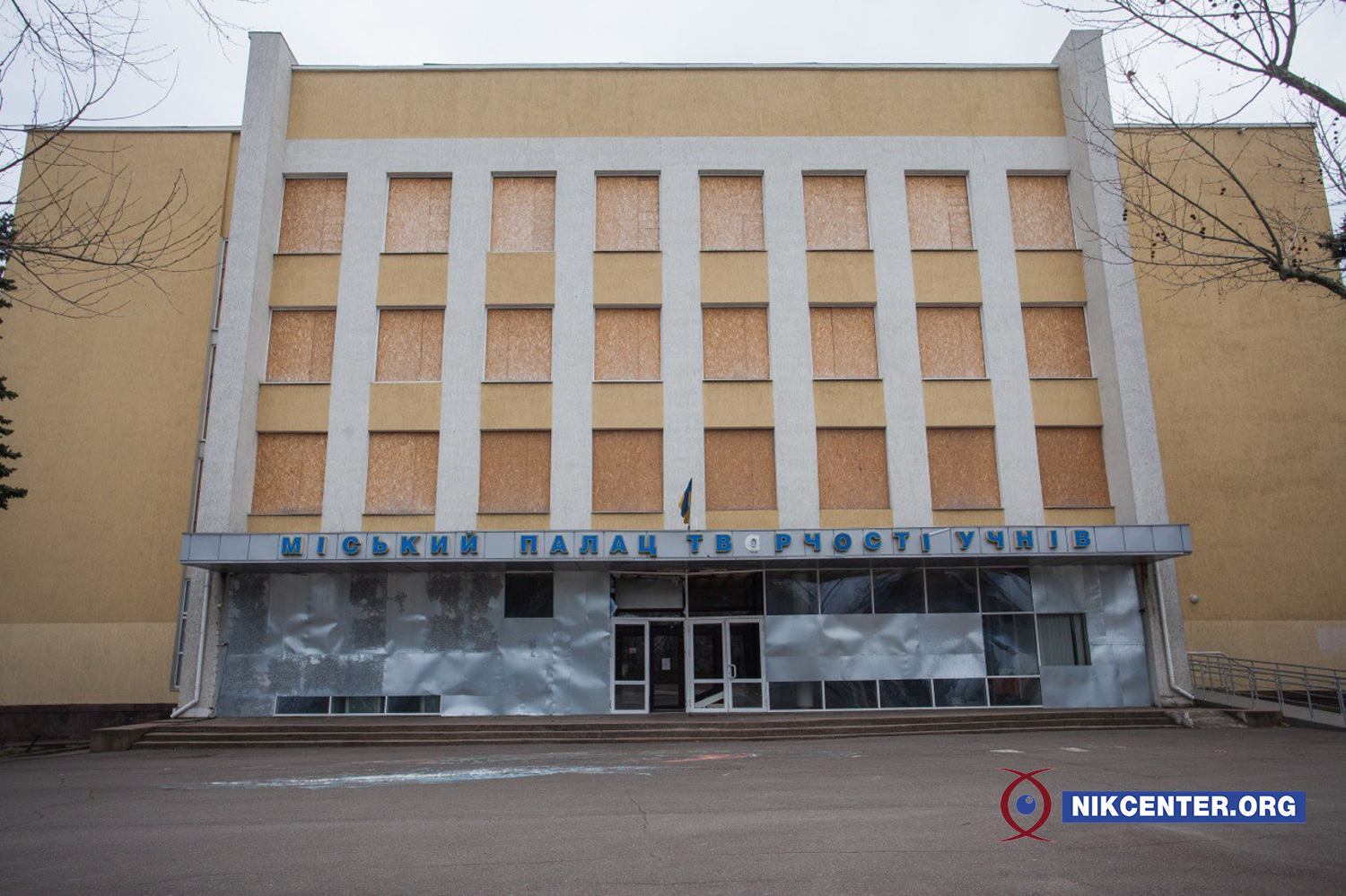 Поряд зі знищеною ОДА розташована будівля міського палацу творчості учнів, яку було пошкоджено вибуховою хвилею. Раніше тут чи не щодня займалися діти, а зараз всі вікна будівлі закриті плитами. На понівеченому палаці залишається український стяг.