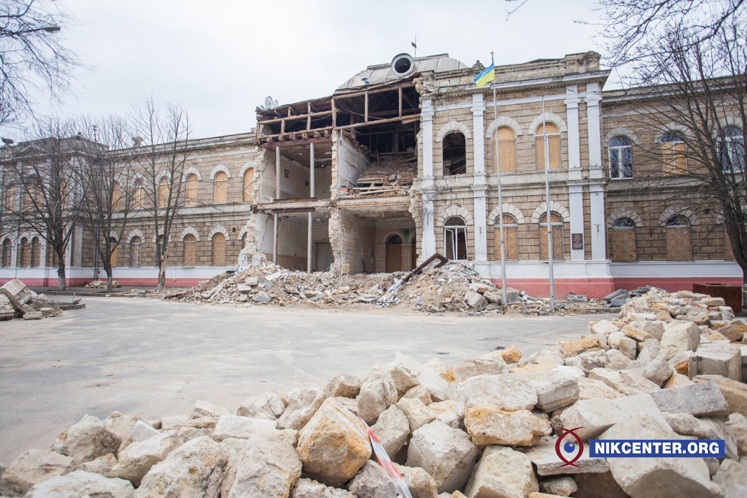 Будівля Миколаївської ОДА. Близько 8:45 29 березня 2022 року у неї поцілила російська крилата ракета, яка призвела до потужного вибуху, повністю зруйнувавши центральну секцію будівлі, від першого до дев’ятого поверхів.